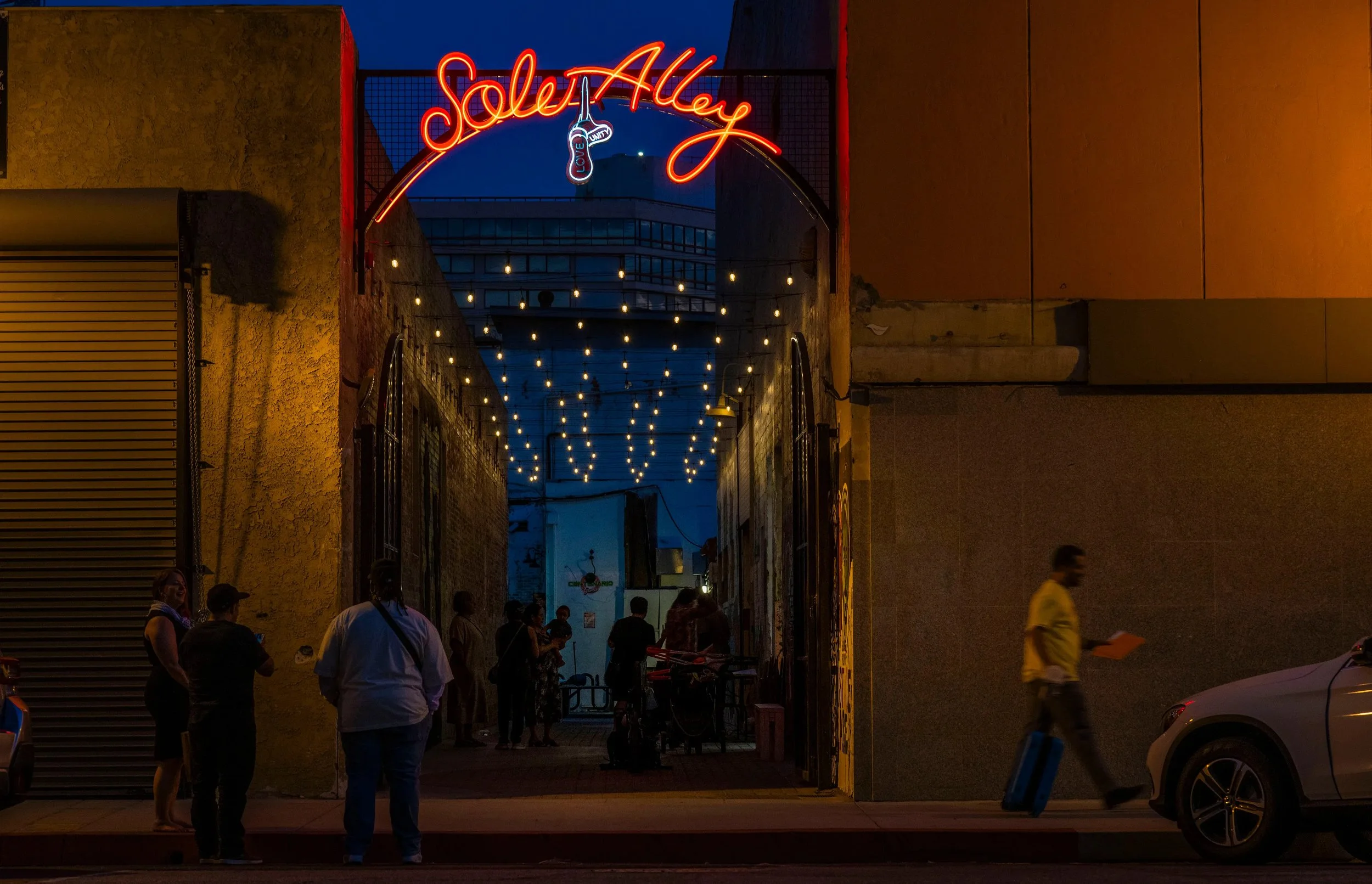 Located on West Fourth Street between D and E streets in the heart of the city’s Historic Arts District, Sole Alley now features community murals, brick-laid pavement, upgraded lighting, public seating, and a neon-lit archway entrance bearing the words “Sole Alley,” flanked by neon shoes and the phrase “Love and Unity.”